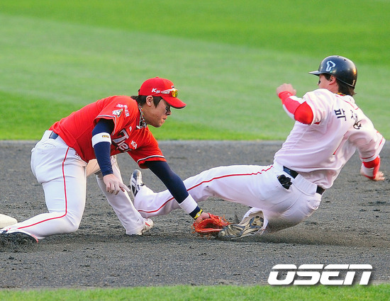 '2011 롯데카드 프로야구' SK 와이번스와 KIA 타이거즈의 준플레이오프 1차전이 8일 문학야구장에서 열렸다. 이 날 경기에서 KIA는 윤석민의 1실점 압권의 호투와 차일목의 만루포에 힘입어 5-1로 SK에 승리를 거뒀다. 9회말 1사 주자 1,2루 타석에서 SK 안치용의 삼진아웃때 1루 주자 박재상과 2루 주자 정근우가 이중도루를 시도, 2루에서 박재상이 안치홍에게 태그아웃을 당하며 경기가 끝나고 있다. 윤석민은 9이닝 동안 3피안타(1홈런) 3탈삼진 2사사구 1실점 쾌투를 펼치며 완투승을 거뒀다. 팀은 9회 차일목의 쐐기 만루홈런으로 1차전 승리를 가져가면서 플레이오프 진출을 위한 고지에 한 걸음 다가섰다. / rumi@osen.co.kr