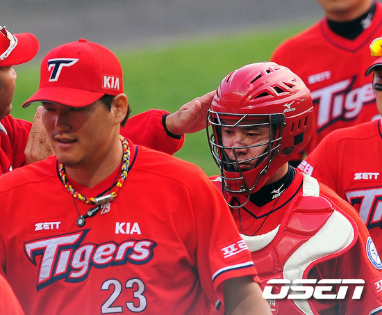 '2011 롯데카드 프로야구' SK 와이번스와 KIA 타이거즈의 준플레이오프 1차전이 8일 문학야구장에서 열렸다. 이 날 경기에서 KIA는 윤석민의 1실점 압권의 호투와 차일목의 만루포에 힘입어 5-1로 SK에 승리를 거뒀다. 경기를 마치고 KIA 차일목이 동료들에게 축하를 받고 있다. 윤석민은 9이닝 동안 3피안타(1홈런) 3탈삼진 2사사구 1실점 쾌투를 펼치며 완투승을 거뒀다. 팀은 9회 차일목의 쐐기 만루홈런으로 1차전 승리를 가져가면서 플레이오프 진출을 위한 고지에 한 걸음 다가섰다. / rumi@osen.co.kr