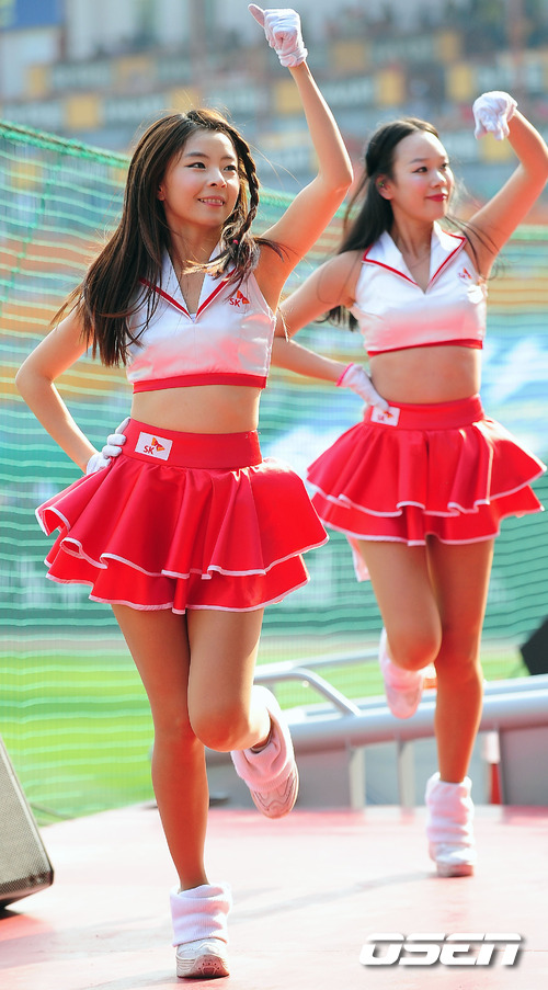 '2011 롯데카드 프로야구' SK 와이번스와 KIA 타이거즈의 준플레이오프 1차전이 8일 문학야구장에서 열렸다. 이 날 경기에서 KIA는 윤석민의 1실점 압권의 호투와 차일목의 만루포에 힘입어 5-1로 SK에 승리를 거뒀다. SK 치어리더들이 단상 위에서 화려한 공연을 펼치고 있다. 윤석민은 9이닝 동안 3피안타(1홈런) 3탈삼진 2사사구 1실점 쾌투를 펼치며 완투승을 거뒀다. 팀은 9회 차일목의 쐐기 만루홈런으로 1차전 승리를 가져가면서 플레이오프 진출을 위한 고지에 한 걸음 다가섰다. / rumi@osen.co.kr