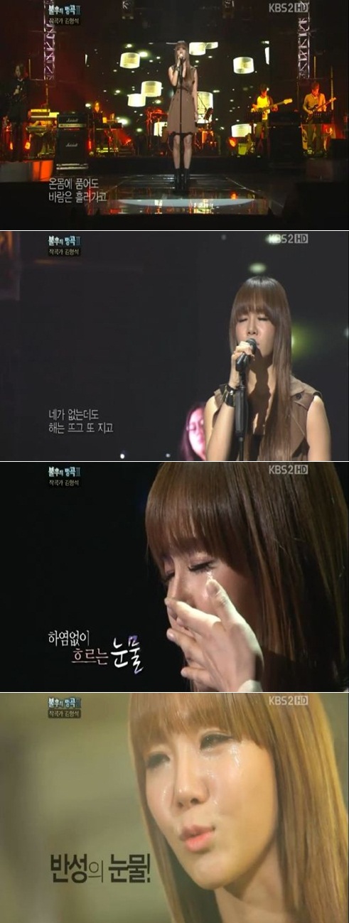 KBS 2TV '자유선언 토요일-불후의 명곡2(이하 불후2)'에서 임정희가 눈물을 흘렸다. 8일 오후 방송된 '불후2'에서는 '작곡가 특집-김형석 편'으로 꾸며졌다. 출연 가수들은 김형석의 히트곡들을 편곡해 경합을 벌였다. 임정희는 "1승이 목표"라며 비장한 각오로 무대에 올랐다. 임정희는 임창정의 '그때 도 다시'를 선곡해 특유의 고음을 폭발시키며 열창했다. 무대 막판에 임정희는 감정이 복 받쳐 눈물을 흘렸다. 이어진 인터뷰에서 임정희는 "곡의 슬픔도 있지만 무대가 끝나자 긴장이 풀리면서 환호하는 관객들을 쳐다보니 눈물이 멈추지 않았다"고 전했다. 임정희는 앞서 솔리드의 '그때 또 다시'를 부른 강민경을 제치고 '첫승'을 차지했다. pontan@osen.co.kr ☞ hoppin 동영상 바로보기 [사진] '불후의 명곡2' 방송 캡처.