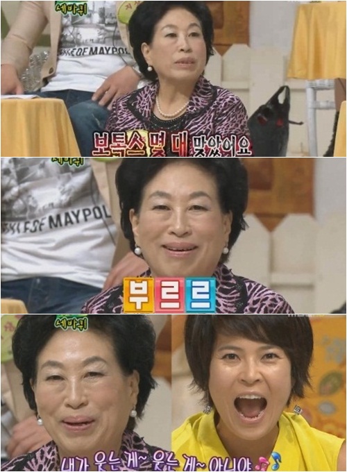 탤런트 전원주가 보톡스 시술을 받았음을 고백했다. 8일 방송된 MBC '세상을 바꾸는 퀴즈(세바퀴)'에 출연한 전원주는 유독 젊어보이는 탱탱해진 피부를 자랑해 MC들에게 "오늘 젊어보이신다"라는 평을 들었다. 과거 보톡스 시술 경험이 있는 조혜련은 "살짝 좀 펴 신 것 같다"고 말했다. 이에 전원주는 "보톡스를 몇 대 맞았다"고 솔직히 고백해 웃음을 자아냈다. 웃는 얼굴이 다소 경직돼 부자연스러운 전원주를 보고 이휘재는 "눈 쪽만 정지 화면이다"고 말했고 이경실은 "두 달 전 조혜련 씨를 보는거 같다"고 전했다. 조혜련은 "두 달 반 이후에는 웃게 되실거다"는 유경험자로서 조언을 들려줬다. 한편 이날 '세바퀴'에는 전원주, 전원주의 며느리 김해현씨, 지상렬과 지상렬 조카 지승아 작가, 고영욱 어머니 이상진 씨, 안상태, 정성호 등이 출연했다. nyc@osen.co.kr