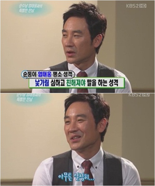 탤런트 엄태웅이 '1박 2일'이 5인 체제가 된 것에 대해 "말도 많이하고 열심히 하겠다"라는 각오를 밝혔다. 엄태웅은 8일 방송된 KBS 2TV '연예가중계'와 진행된 인터뷰에서 강호동의 잠정 하차로 5인 체제가 된 것에 대해 "다 같이 끝까지 열심히 하겠다. 말도 많이 하고 더 열심히 할 생각이다"고 털어놨다. 마지막을 함께 할 수 있어 행복하다고 엄태웅이 밝힌 본인의 평소 성격은 낯가림이 심하고 친해져야 말을 많이 하는 성격이다. 또 엄태웅은 지난 5월 방송된 KBS 2TV '해피선데이-1박2일'에서 수애에게 문자가 온 모습이 멤버들에게 포착돼 수애와 열애설에 휩싸인 바 있는 수애와의 관계에 대해 "주위에 아무도 없으면 연락해서 맞으면 밥을 먹으며 일 얘기 한다. 기분 좋고 항상 소중한 친구다"고 털어놨다. 그런가하면 엄태웅은 '순수남'이라 불리는 것에 대해 "좋은 것 같은데 나이가 서른 여덟에 순수하면 얼마나 순수하겠나. 그리 순수하진 않은 것 같다"라고 고백했다. nyc@osen.co.kr ☞ hoppin 동영상 바로보기