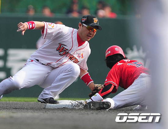 '2011 롯데카드 프로야구' SK 와이번스와 KIA 타이거즈의 준플레이오프 2차전이 9일 문학야구장에서 열렸다. 1회초 1사 1루 김선빈 타석때 1루 주자 이용규 2루 도루에 성공하고 있다. 준플레이오프 2차전에서는 SK 송은범(27)과 KIA 로페즈(36)가 첫 선발 맞대결을 펼친다. 3선승제의 준플레이오프 1차전을 내줘 쫓기는 입장이 된 SK로서는 2차전을 반드시 승리로 이끌어야 한다. 그런 만큼 송은범의 피칭에 기대를 걸어야 한다. 그에 반해 로페즈는 1차전에서 윤석민의 완투승으로 인해 상대적인 부담을 덜 수 있게 됐다. KIA는 지난해까지 4년 중 3번의 가을 잔치서 '리버스 스윕'으로 두 번의 한국시리즈 패권을 거머쥐었고 한국시리즈행 티켓도 쥔 바 있는 SK이기에 1승을 잊고 경기에 임하겠다는 각오. 한편 SK는 시즌 종반 김성근 전 감독의 사퇴로 내홍을 앓았고, KIA는 시즌 중반 1위에서 4위로 떨어지는 심각한 성적 하락을 겪었다. 프로야구 준플레이오프 5전 3선승제로 진행된다. 8~9일 인천 문학구장에서 2연전이 열리고 하루를 쉰 뒤 11~12일 광주구장에서 3, 4차전이 이어진다. 4차전까지 승부를 가리지 못하면 14일 문학구장으로 돌아와 최종전을 벌인다. / ajyong@osen.co.kr