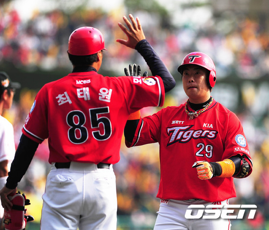 '2011 롯데카드 프로야구' SK 와이번스와 KIA 타이거즈의 준플레이오프 2차전이 9일 문학야구장에서 열렸다. 1회초 2사 2루 나지완 우익수앞 선취 1타점 적시타를날리고 최태원 1루 코치의 환영을 받고 있다. 준플레이오프 2차전에서는 SK 송은범(27)과 KIA 로페즈(36)가 첫 선발 맞대결을 펼친다. 3선승제의 준플레이오프 1차전을 내줘 쫓기는 입장이 된 SK로서는 2차전을 반드시 승리로 이끌어야 한다. 그런 만큼 송은범의 피칭에 기대를 걸어야 한다. 그에 반해 로페즈는 1차전에서 윤석민의 완투승으로 인해 상대적인 부담을 덜 수 있게 됐다. KIA는 지난해까지 4년 중 3번의 가을 잔치서 '리버스 스윕'으로 두 번의 한국시리즈 패권을 거머쥐었고 한국시리즈행 티켓도 쥔 바 있는 SK이기에 1승을 잊고 경기에 임하겠다는 각오. 한편 SK는 시즌 종반 김성근 전 감독의 사퇴로 내홍을 앓았고, KIA는 시즌 중반 1위에서 4위로 떨어지는 심각한 성적 하락을 겪었다. 프로야구 준플레이오프 5전 3선승제로 진행된다. 8~9일 인천 문학구장에서 2연전이 열리고 하루를 쉰 뒤 11~12일 광주구장에서 3, 4차전이 이어진다. 4차전까지 승부를 가리지 못하면 14일 문학구장으로 돌아와 최종전을 벌인다. / ajyong@osen.co.kr