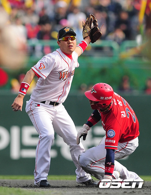 '2011 롯데카드 프로야구' SK 와이번스와 KIA 타이거즈의 준플레이오프 2차전이 9일 문학야구장에서 열렸다. 2회초 1사 1루 최희섭 타석때 1루 주자 김상현 2루도루를 하였으나 태그아웃 처리되고 있다. 준플레이오프 2차전에서는 SK 송은범(27)과 KIA 로페즈(36)가 첫 선발 맞대결을 펼친다. 3선승제의 준플레이오프 1차전을 내줘 쫓기는 입장이 된 SK로서는 2차전을 반드시 승리로 이끌어야 한다. 그런 만큼 송은범의 피칭에 기대를 걸어야 한다. 그에 반해 로페즈는 1차전에서 윤석민의 완투승으로 인해 상대적인 부담을 덜 수 있게 됐다. KIA는 지난해까지 4년 중 3번의 가을 잔치서 '리버스 스윕'으로 두 번의 한국시리즈 패권을 거머쥐었고 한국시리즈행 티켓도 쥔 바 있는 SK이기에 1승을 잊고 경기에 임하겠다는 각오. 한편 SK는 시즌 종반 김성근 전 감독의 사퇴로 내홍을 앓았고, KIA는 시즌 중반 1위에서 4위로 떨어지는 심각한 성적 하락을 겪었다. 프로야구 준플레이오프 5전 3선승제로 진행된다. 8~9일 인천 문학구장에서 2연전이 열리고 하루를 쉰 뒤 11~12일 광주구장에서 3, 4차전이 이어진다. 4차전까지 승부를 가리지 못하면 14일 문학구장으로 돌아와 최종전을 벌인다. / ajyong@osen.co.kr