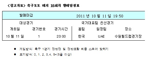 [축구토토] 축구 국가대표팀 경기 결과를 알아맞히는 축구토토 매치 게임이 한국과 아랍에미레이트연합(UAE)의 대표팀간 경기를 대상으로 축구팬들을 찾아간다. 스포츠토토(www.sportstoto.co.kr)는 오는 11일(화) 오후 8시 수원월드컵경기장에서 벌어지는 한국과 UAE의 2014 브라질 월드컵 3차예선전을 대상으로 축구토토 매치 16회차 게임을 시행한다고 밝혔다. 축구토토매치 게임방식은 대한축구협회 및 프로축구연맹 등이 주최하는 축구 1경기(국가대표 A매치, 주요 해외 경기 등)의 전반전 득점 및 전반포함 최종 득점을 예상하여 맞히는 것으로 최종득점은 0, 1, 2, 3, 4, 5+(5골 이상) 등 총 6개 항목으로 구성된다. 전반 및 최종 스코어를 모두 정확히 맞힌 사람에게는 해당 회차의 배당률에다 베팅금액을 곱한 만큼 적중상금이 지급된다. 축구토토 게임에 참여하려면 경기시작 10분전까지 편의점과 복권방 등 전국에 구비된 스포츠토토 공식 판매점이나 공식 온라인 발매사이트인 ‘베트맨’(www.betman.co.kr)을 방문하면 된다. 베팅금액은 최소 100원에서 10만원 한도 내에서 자유롭게 선택할 수 있고, 각 팀의 스코어는 1개 이상 최대 6개 까지 복식 투표가 가능하다. 스포츠토토 관계자는 “2014년 브라질월드컵 본선 진출을 노리고 있는 한국대표팀과 UAE대표팀의 일전을 대상으로 축구토토 매치 게임이 발행된다” 며 “지난주 폴란드전에서 박주영의 연속골로 분위기를 띄운 한국대표팀이 수비의 불안을 이번 UAE전에서는 어떻게 대처하는 지에 다라 득점대가 나눠질 것으로 예상된다”고 밝혔다.