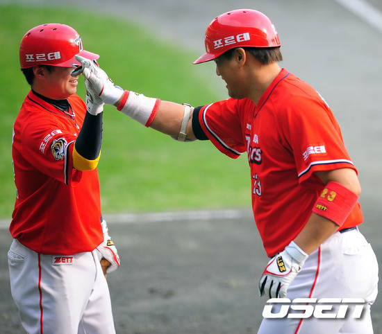 '2011 롯데카드 프로야구' SK 와이번스와 KIA 타이거즈의 준플레이오프 2차전이 9일 문학야구장에서 열렸다. 5회초 1사 주자 없는 상황에서 KIA 최희섭이 좌월 솔로홈런을 날린 후 홈에서 차일목과 하이파이브를 하고 있다. 준플레이오프 2차전에서는 SK 송은범(27)과 KIA 로페즈(36)가 첫 선발 맞대결을 펼쳤다. 3선승제의 준플레이오프 1차전을 내줘 쫓기는 입장이 된 SK로서는 2차전을 반드시 승리로 이끌어야 한다. 그런 만큼 송은범의 피칭에 기대를 걸어야 한다. 그에 반해 로페즈는 1차전에서 윤석민의 완투승으로 인해 상대적인 부담을 덜 수 있게 됐다. KIA는 지난해까지 4년 중 3번의 가을 잔치서 '리버스 스윕'으로 두 번의 한국시리즈 패권을 거머쥐었고 한국시리즈행 티켓도 쥔 바 있는 SK이기에 1승을 잊고 경기에 임하겠다는 각오. 한편 SK는 시즌 종반 김성근 전 감독의 사퇴로 내홍을 앓았고, KIA는 시즌 중반 1위에서 4위로 떨어지는 심각한 성적 하락을 겪었다. 프로야구 준플레이오프 5전 3선승제로 진행된다. 8~9일 인천 문학구장에서 2연전이 열리고 하루를 쉰 뒤 11~12일 광주구장에서 3, 4차전이 이어진다. 4차전까지 승부를 가리지 못하면 14일 문학구장으로 돌아와 최종전을 벌인다. / rumi@osen.co.kr