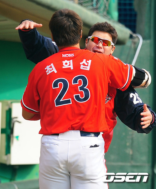 '2011 롯데카드 프로야구' SK 와이번스와 KIA 타이거즈의 준플레이오프 2차전이 9일 문학야구장에서 열렸다. 5회초 1사 주자 없는 상황에서 KIA 최희섭이 좌월 솔로홈런을 날린 후 덕아웃에서 서재응과 기쁨을 나누고 있다. 준플레이오프 2차전에서는 SK 송은범(27)과 KIA 로페즈(36)가 첫 선발 맞대결을 펼쳤다. 3선승제의 준플레이오프 1차전을 내줘 쫓기는 입장이 된 SK로서는 2차전을 반드시 승리로 이끌어야 한다. 그런 만큼 송은범의 피칭에 기대를 걸어야 한다. 그에 반해 로페즈는 1차전에서 윤석민의 완투승으로 인해 상대적인 부담을 덜 수 있게 됐다. KIA는 지난해까지 4년 중 3번의 가을 잔치서 '리버스 스윕'으로 두 번의 한국시리즈 패권을 거머쥐었고 한국시리즈행 티켓도 쥔 바 있는 SK이기에 1승을 잊고 경기에 임하겠다는 각오. 한편 SK는 시즌 종반 김성근 전 감독의 사퇴로 내홍을 앓았고, KIA는 시즌 중반 1위에서 4위로 떨어지는 심각한 성적 하락을 겪었다. 프로야구 준플레이오프 5전 3선승제로 진행된다. 8~9일 인천 문학구장에서 2연전이 열리고 하루를 쉰 뒤 11~12일 광주구장에서 3, 4차전이 이어진다. 4차전까지 승부를 가리지 못하면 14일 문학구장으로 돌아와 최종전을 벌인다. / rumi@osen.co.kr
