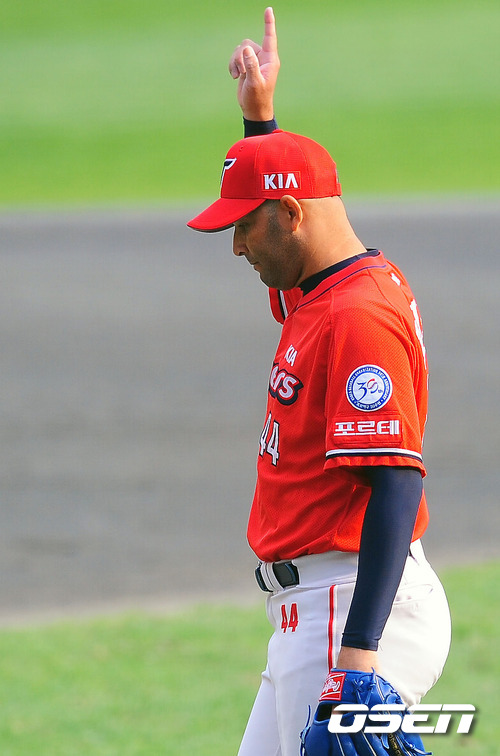 '2011 롯데카드 프로야구' SK 와이번스와 KIA 타이거즈의 준플레이오프 2차전이 9일 문학야구장에서 열렸다. 6회말을 마친 후 KIA 선발 로페즈가 하늘을 향해 사인을 보내고 있다. 준플레이오프 2차전에서는 SK 송은범(27)과 KIA 로페즈(36)가 첫 선발 맞대결을 펼쳤다. 3선승제의 준플레이오프 1차전을 내줘 쫓기는 입장이 된 SK로서는 2차전을 반드시 승리로 이끌어야 한다. 그런 만큼 송은범의 피칭에 기대를 걸어야 한다. 그에 반해 로페즈는 1차전에서 윤석민의 완투승으로 인해 상대적인 부담을 덜 수 있게 됐다. KIA는 지난해까지 4년 중 3번의 가을 잔치서 '리버스 스윕'으로 두 번의 한국시리즈 패권을 거머쥐었고 한국시리즈행 티켓도 쥔 바 있는 SK이기에 1승을 잊고 경기에 임하겠다는 각오. 한편 SK는 시즌 종반 김성근 전 감독의 사퇴로 내홍을 앓았고, KIA는 시즌 중반 1위에서 4위로 떨어지는 심각한 성적 하락을 겪었다. 프로야구 준플레이오프 5전 3선승제로 진행된다. 8~9일 인천 문학구장에서 2연전이 열리고 하루를 쉰 뒤 11~12일 광주구장에서 3, 4차전이 이어진다. 4차전까지 승부를 가리지 못하면 14일 문학구장으로 돌아와 최종전을 벌인다. / rumi@osen.co.kr
