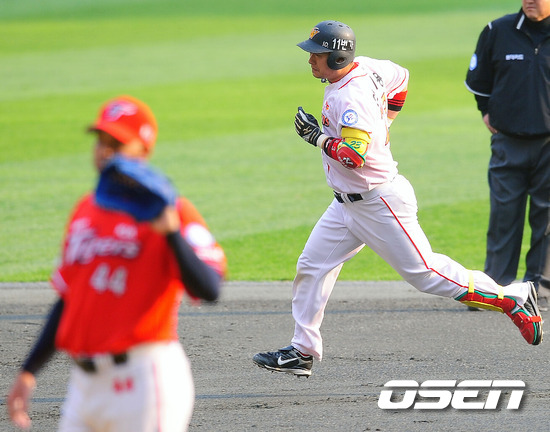 '2011 롯데카드 프로야구' SK 와이번스와 KIA 타이거즈의 준플레이오프 2차전이 9일 문학야구장에서 열렸다. 7회말 대타 안치용이 첫타석에서 좌월 솔로 홈런을 날린 후 그라운드를 돌고 있다. 준플레이오프 2차전에서는 SK 송은범(27)과 KIA 로페즈(36)가 첫 선발 맞대결을 펼쳤다. 3선승제의 준플레이오프 1차전을 내줘 쫓기는 입장이 된 SK로서는 2차전을 반드시 승리로 이끌어야 한다. 그런 만큼 송은범의 피칭에 기대를 걸어야 한다. 그에 반해 로페즈는 1차전에서 윤석민의 완투승으로 인해 상대적인 부담을 덜 수 있게 됐다. KIA는 지난해까지 4년 중 3번의 가을 잔치서 '리버스 스윕'으로 두 번의 한국시리즈 패권을 거머쥐었고 한국시리즈행 티켓도 쥔 바 있는 SK이기에 1승을 잊고 경기에 임하겠다는 각오. 한편 SK는 시즌 종반 김성근 전 감독의 사퇴로 내홍을 앓았고, KIA는 시즌 중반 1위에서 4위로 떨어지는 심각한 성적 하락을 겪었다. 프로야구 준플레이오프 5전 3선승제로 진행된다. 8~9일 인천 문학구장에서 2연전이 열리고 하루를 쉰 뒤 11~12일 광주구장에서 3, 4차전이 이어진다. 4차전까지 승부를 가리지 못하면 14일 문학구장으로 돌아와 최종전을 벌인다. / rumi@osen.co.kr