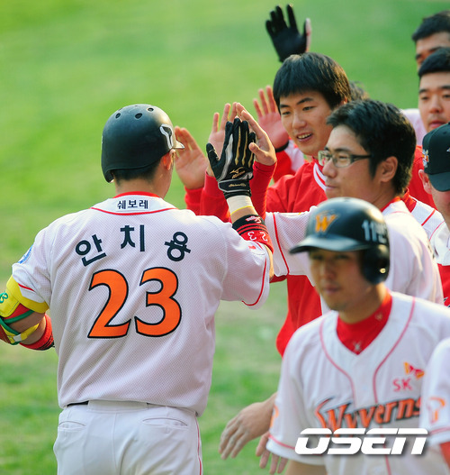 '2011 롯데카드 프로야구' SK 와이번스와 KIA 타이거즈의 준플레이오프 2차전이 9일 문학야구장에서 열렸다. 7회말 대타 안치용이 첫타석에서 좌월 솔로 홈런을 날린 후 덕아웃에서 동료들과 하이파이브를 하고 있다. 준플레이오프 2차전에서는 SK 송은범(27)과 KIA 로페즈(36)가 첫 선발 맞대결을 펼쳤다. 3선승제의 준플레이오프 1차전을 내줘 쫓기는 입장이 된 SK로서는 2차전을 반드시 승리로 이끌어야 한다. 그런 만큼 송은범의 피칭에 기대를 걸어야 한다. 그에 반해 로페즈는 1차전에서 윤석민의 완투승으로 인해 상대적인 부담을 덜 수 있게 됐다. KIA는 지난해까지 4년 중 3번의 가을 잔치서 '리버스 스윕'으로 두 번의 한국시리즈 패권을 거머쥐었고 한국시리즈행 티켓도 쥔 바 있는 SK이기에 1승을 잊고 경기에 임하겠다는 각오. 한편 SK는 시즌 종반 김성근 전 감독의 사퇴로 내홍을 앓았고, KIA는 시즌 중반 1위에서 4위로 떨어지는 심각한 성적 하락을 겪었다. 프로야구 준플레이오프 5전 3선승제로 진행된다. 8~9일 인천 문학구장에서 2연전이 열리고 하루를 쉰 뒤 11~12일 광주구장에서 3, 4차전이 이어진다. 4차전까지 승부를 가리지 못하면 14일 문학구장으로 돌아와 최종전을 벌인다. / rumi@osen.co.kr