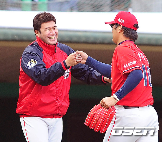 '2011 롯데카드 프로야구' SK 와이번스와 KIA 타이거즈의 준플레이오프 2차전이 9일 문학야구장에서 열렸다. 9회말 2사 만루에서 KIA 한기주가 이호준을 내야땅볼로 처리하며 공수교대때 서재응의 축하를 받고 있다. 3선승제의 준플레이오프 1차전을 내줘 쫓기는 입장이 된 SK로서는 2차전을 반드시 승리로 이끌어야 한다. KIA는 지난해까지 4년 중 3번의 가을 잔치서 '리버스 스윕'으로 두 번의 한국시리즈 패권을 거머쥐었고 한국시리즈행 티켓도 쥔 바 있는 SK이기에 1승을 잊고 경기에 임하겠다는 각오. 한편 SK는 시즌 종반 김성근 전 감독의 사퇴로 내홍을 앓았고, KIA는 시즌 중반 1위에서 4위로 떨어지는 심각한 성적 하락을 겪었다. 프로야구 준플레이오프 5전 3선승제로 진행된다. 8~9일 인천 문학구장에서 2연전이 열리고 하루를 쉰 뒤 11~12일 광주구장에서 3, 4차전이 이어진다. 4차전까지 승부를 가리지 못하면 14일 문학구장으로 돌아와 최종전을 벌인다. / ajyong@osen.co.kr