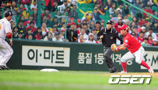 '2011 롯데카드 프로야구' SK 와이번스와 KIA 타이거즈의 준플레이오프 2차전이 9일 문학야구장에서 열렸다. 연장11회말 1사 2,3루 최정 3루앞 땅볼때 KIA 박기남 3루수가 수비를 펼치며 타자주자를 아웃처리 시키고 있다. 3선승제의 준플레이오프 1차전을 내줘 쫓기는 입장이 된 SK로서는 2차전을 반드시 승리로 이끌어야 한다. KIA는 지난해까지 4년 중 3번의 가을 잔치서 '리버스 스윕'으로 두 번의 한국시리즈 패권을 거머쥐었고 한국시리즈행 티켓도 쥔 바 있는 SK이기에 1승을 잊고 경기에 임하겠다는 각오. 한편 SK는 시즌 종반 김성근 전 감독의 사퇴로 내홍을 앓았고, KIA는 시즌 중반 1위에서 4위로 떨어지는 심각한 성적 하락을 겪었다. 프로야구 준플레이오프 5전 3선승제로 진행된다. 8~9일 인천 문학구장에서 2연전이 열리고 하루를 쉰 뒤 11~12일 광주구장에서 3, 4차전이 이어진다. 4차전까지 승부를 가리지 못하면 14일 문학구장으로 돌아와 최종전을 벌인다. / ajyong@osen.co.kr