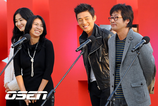 9일 오후 부산 해운대 피프빌리지에서 열린 영화 '완득이' 야외 무대인사에서 출연배우들이 미소 짓고 있다. 개성과 인간미 넘치는 교사 김윤석과 거칠지만 깊은 속내의 반항아 유아인의 연기 호흡이 기대되는 영화 '완득이'는 오는 20일 개봉된다. 한편 아시아 최대 영화제로 떠오른 부산국제영화제는 지난 6일 부산 영화의전당 야외극장에서 화려한 개막식을 시작으로 9일 간의 대장정을 돌입했다./ soul1014@osen.co.kr