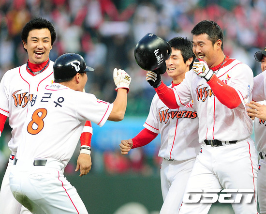 '2011 롯데카드 프로야구' SK 와이번스와 KIA 타이거즈의 준플레이오프 2차전이 9일 문학야구장에서 열렸다. 연장 11회말 2사 만루 이호준이 끝내기 안타를 날리고 정근우의 환영을 받으며 환호하고 있다. 3선승제의 준플레이오프 1차전을 내줘 쫓기는 입장이 된 SK로서는 2차전을 반드시 승리로 이끌어야 한다. KIA는 지난해까지 4년 중 3번의 가을 잔치서 '리버스 스윕'으로 두 번의 한국시리즈 패권을 거머쥐었고 한국시리즈행 티켓도 쥔 바 있는 SK이기에 1승을 잊고 경기에 임하겠다는 각오. 한편 SK는 시즌 종반 김성근 전 감독의 사퇴로 내홍을 앓았고, KIA는 시즌 중반 1위에서 4위로 떨어지는 심각한 성적 하락을 겪었다. 프로야구 준플레이오프 5전 3선승제로 진행된다. 8~9일 인천 문학구장에서 2연전이 열리고 하루를 쉰 뒤 11~12일 광주구장에서 3, 4차전이 이어진다. 4차전까지 승부를 가리지 못하면 14일 문학구장으로 돌아와 최종전을 벌인다. / ajyong@osen.co.kr