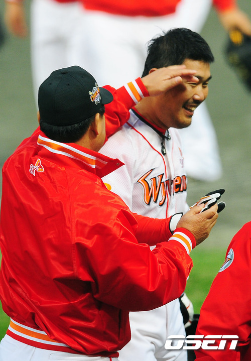 '2011 롯데카드 프로야구' SK 와이번스와 KIA 타이거즈의 준플레이오프 2차전이 9일 문학야구장에서 열렸다. 이 날 경기에서 탄탄한 계투진의 활약과 연장 11회말 이호준의 끝내기안타에 힘입어 3-2로 역전승을 거두었다. 1차전 패배를 설욕한 SK는 준플레이오프 1승1패로 승부를 원점으로 돌려놓았다. 경기를 마치고 이만수 감독 대행이 이호준의 머리를 때리고 있다. SK는 연장 11회말 승부를 결정냈다. 7회2사후 등판한 한기주가 계속 마운드에 올라왔고 선두타자로 나선 안치용이 볼넷을 골랐다. 이어 정근우가 3유간을 가르는 안타로 무사 1,2루 기회를 잡았다.박재상의 희생번트에 이어 최정이 3루 땅볼로 물러났고 박정권의 볼넷으로 2사 만루. 9회 똑같은 기회에서 유격수 땅볼로 물러난 이호준이중견수 앞으로 굴러가는 적시타를 날려 지루한 승부에 마침표를 찍었다. / rumi@osen.co.kr