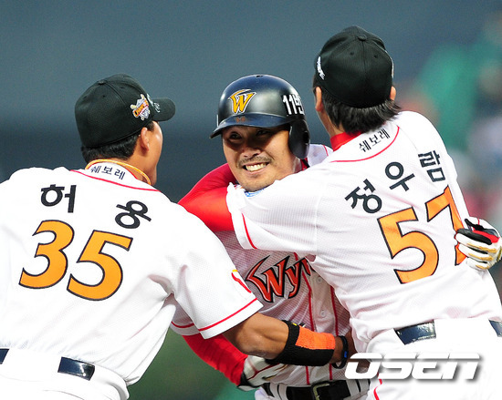 '2011 롯데카드 프로야구' SK 와이번스와 KIA 타이거즈의 준플레이오프 2차전이 9일 문학야구장에서 열렸다. 연장11회말 2사 만루에서 이호준이 끝내기 안타를 날리고 동료들의 환영을 받고 있다. 승부는 원점이다. SK가 연장승부를 잡아내며반격에 성공했다. SK는 9일 인천 문학구장에서 열린 2011 롯데카드 프로야구 준플레이오프 2차전에서 탄탄한 계투진의 활약과 연장 11회말 이호준의 끝내기안타에 힘입어 3-2로 역전승을 거두었다. 1차전 패배를 설욕한 SK는 준플레이오프 1승1패로 승부를 원점으로 돌려놓았다. SK는 연장 11회말 승부를 결정냈다. 7회2사후 등판한 한기주가 계속 마운드에 올라왔고 선두타자로 나선 안치용이 볼넷을 골랐다. 이어 정근우가 3루간을 가르는 안타로 무사 1,2루 기회를 잡았다.박재상의 희생번트에 이어 최정이 3루 땅볼로 물러났고 박정권의 볼넷으로 2사 만루. 9회 똑같은 기회에서 유격수 땅볼로 물러난 이호준이 중견수 앞으로 굴러가는 적시타를 날려 지루한 승부에 마침표를 찍었다. / ajyong@osen.co.kr