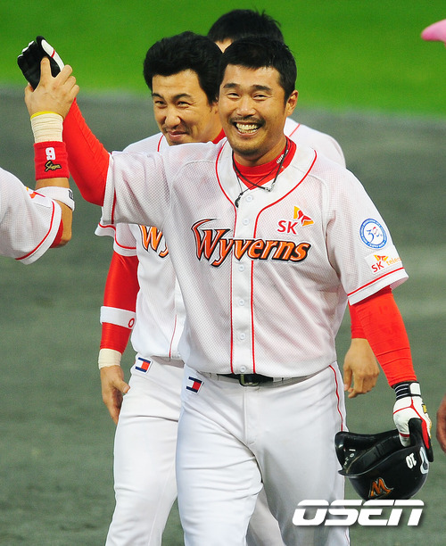 '2011 롯데카드 프로야구' SK 와이번스와 KIA 타이거즈의 준플레이오프 2차전이 9일 문학야구장에서 열렸다. 이 날 경기에서 탄탄한 계투진의 활약과 연장 11회말 이호준의 끝내기안타에 힘입어 3-2로 역전승을 거두었다. 1차전 패배를 설욕한 SK는 준플레이오프 1승1패로 승부를 원점으로 돌려놓았다. 경기를 마치고 SK 이호준이 동료들과 기쁨을 나누고 있다. SK는 연장 11회말 승부를 결정냈다. 7회2사후 등판한 한기주가 계속 마운드에 올라왔고 선두타자로 나선 안치용이 볼넷을 골랐다. 이어 정근우가 3유간을 가르는 안타로 무사 1,2루 기회를 잡았다.박재상의 희생번트에 이어 최정이 3루 땅볼로 물러났고 박정권의 볼넷으로 2사 만루. 9회 똑같은 기회에서 유격수 땅볼로 물러난 이호준이중견수 앞으로 굴러가는 적시타를 날려 지루한 승부에 마침표를 찍었다. / rumi@osen.co.kr