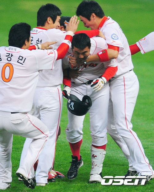 '2011 롯데카드 프로야구' SK 와이번스와 KIA 타이거즈의 준플레이오프 2차전이 9일 문학야구장에서 열렸다. 이 날 경기에서 탄탄한 계투진의 활약과 연장 11회말 이호준의 끝내기안타에 힘입어 3-2로 역전승을 거두었다. 1차전 패배를 설욕한 SK는 준플레이오프 1승1패로 승부를 원점으로 돌려놓았다. 경기를 마치고 SK 이호준이 동료들과 기쁨을 나누고 있다. SK는 연장 11회말 승부를 결정냈다. 7회2사후 등판한 한기주가 계속 마운드에 올라왔고 선두타자로 나선 안치용이 볼넷을 골랐다. 이어 정근우가 3유간을 가르는 안타로 무사 1,2루 기회를 잡았다.박재상의 희생번트에 이어 최정이 3루 땅볼로 물러났고 박정권의 볼넷으로 2사 만루. 9회 똑같은 기회에서 유격수 땅볼로 물러난 이호준이중견수 앞으로 굴러가는 적시타를 날려 지루한 승부에 마침표를 찍었다. / rumi@osen.co.kr