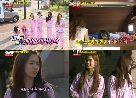 소녀시대와 런닝맨이 파자마를 입고 레이스를 펼쳤다. 9일 방송된 SBS '일요일이 좋다, 런닝맨'에서 펼쳐진 ‘파자마 레이스’에서는 소녀시대와 런닝맨들이 기상한 순서대로 커플이 된 후 곧바로 레이스를 시작했다. 캠핑카에서 잠이 든 소녀시대 멤버 여섯명(윤아, 유리, 태연, 제시카, 효연, 서현)은 일어나자마자 파자마를 입고 미션 장소인 영어마을을 질주했다. 막 잠에서 깬 소녀시대는 얼굴이 퉁퉁 부었다면서도 변함없이 상큼한 모습을 보여줘 눈길을 모았다. 일어난 순서대로 커플이 된 런닝맨들과 소녀시대는 술래인 유재석-서현 커플을 피해 레이스를 펼치며 긴장감을 안겼다. happy@osen.co.kr [사진]'런닝맨' 캡처.