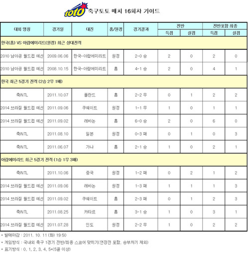[축구토토] 국민체육진흥공단(www.kspo.or.kr)이 발행하는 체육진흥투표권 수탁사업자 스포츠토토의 공식 온라인 발매 사이트 베트맨(www.betman.co.kr)이 오는 11일 오후 8시 수원월드컵경기장에서 열리는 한국(홈.FIFA 랭킹 29위)과 아랍에미리트(원정•112위)의 2014년 브라질월드컵 3차 예선을 대상으로 한 축구토토 매치 16회차 투표율 중간집계 결과, 전체 참가자의 78.83%는 한국이 아랍에미리트(UAE)를 상대로 승리를 거둘 것으로 전망했다고 밝혔다. 아랍에미리트의 승리를 예상한 참가자는 8.78%에 불과했고, 나머지 12.37%는 무승부를 예상했다. 전반전에서는 한국 리드 예상(62.51%)이 가장 높게 집계됐고, 무승부 예상(25.78%)과 아랍에미리트 리드 예상(11.71%)이 뒤를 이었다. 전반전 스코어의 경우 1-0 한국 리드 예상(24.84%)이 최다를 차지했고, 최종 스코어에서는 3-1 한국 승리 예상(12.59%)이 가장 높게 집계됐다. 스포츠토토 관계자는 "대다수 축구팬들은 이번 게임에서 상대전적 9승 5무 2패로 아랍에미리트를 압도하고 있는 '아시아의 호랑이' 한국의 승리를 점쳤다"며 "특히 이번 경기는 평가전이었던 지난 폴란드전과 달리 월드컵 아시아지역 최종예선 티켓이 걸린 중요한 자리인데다, 한국의 안방에서 펼쳐지기 때문에 양국의 입장을 충분히 감안한 베팅이 필요할 것"이라고 밝혔다. 축구토토 매치 게임은 국가대표팀의 A매치 경기나 월드컵, 올림픽 등 빅매치 1개 경기를 대상으로 발행되고, 1경기 2팀의 전반 스코어 및 최종 스코어(연장 포함/승부차기 제외)를 맞히면 된다. 이번 축구토토 매치 16회차는 11일 오후 7시 50분에 발매가 마감된다.