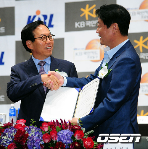 [OSEN= 백승철 인턴기자] 10일 오전 서울 소공동 웨스틴 조선호텔에서 열린 KBL과 KB국민카드 '2011-2012 KB국민카드 프로농구' 타이틀 스폰서 조인식에 참석한 KB국민카드 최기의 사장과 한선교 KBL 총재가 악수를 나누고 있다. 이날 조인식은 프로농구 시즌 개막을 맞아 개최된 '2011-2012 KB국민카드 프로농구' 미디어데이 행사에 앞서 KBL 한선교 총재, KB국민카드 최기의 사장 등 관계자들이 참석한 가운데 진행되었다. 조인식에서 공개된 '2011-2012 KB국민카드 프로농구' 공식 엠블럼은 KB국민카드의 기업컬러인 Golden Yellow를 활용하여 카드 모티브인 둥근 사각형 모양과 역동성, 스피드, 공정성을 상징하는 '농구공'을 합해 신선하고 에너지 넘치는 새로운 바람을 농구코트에 불러일으키겠다는 의지를 담고 있다. / baik@osen.co.kr