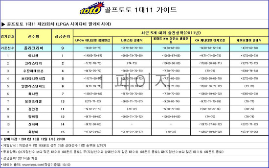 [골프토토] 국내 골프팬들은 '골프토토 1대11' 23회차에서 기준선수 폴라크리머가 9개 매치에서 승리를 거둘 것으로 내다봤다. 국민체육진흥공단(www.kspo.or.kr)이 발행하는 체육진흥투표권 수탁사업자인 스포츠토토 공식 온라인 발매 사이트인 베트맨(www.betman.co.kr)이 13일 말레이시아 쿠알라룸푸르에서 열리는 미국여자프로골프(LPGA)투어 시메다비 말레이시아 1라운드를 대상으로 '골프토토 1대11' 23회차를 발매한다. 전체 게임 참가자들은 기준선수로 지정된 폴라크리머가 상대선수 9명보다 적은 타수로 1라운드를 종료할 것을 예상했다고 밝혔다. 기준 선수 폴라크리머는 김인경(81.98%), 양희영(78.08%), 위성미(75.98%), 신지애(74.17%), 모건프레셀(68.17%), 수잔 페테르손(67.87%), 브리타니린시컴 (59.16%), 최나연(54.35%), 크리스티커(53.15%) 보다 좋은 성적을 기록할 것이라는 예상이 최다를 차지했다. 폴라크리머는 지난 3월 LPGA투어 파운더스컵에서 준우승을 거뒀으며 작년 US여자오픈에서 우승을 거두는 등 꾸준히 좋은 성적을 내고 있다. 한편, 1번 선수 야니 챙(70.57%)과 5번 선수 안젤라스탠퍼드(44.14%)는 폴라크리머보다 적은 타수를 기록할 것으로 예상돼 우세가 전망됐다. 이번 시즌 LPGA 6승을 기록한 상금 랭킹 1위 야니 챙은 참가선수 중 유일하게 평균 60대 타수를 기록하고 있다. LPGA 시메다비 말레이시아는 작년 강지민이 9언더파로 극적인 우승을 거두며 화제가 됐던 대회이다. 특히 이번 대회에서 한국선수들이 LPGA 투어 진출 통상 100승을 달성할 수 있을지 여부가 기대를 모으고 있다. '골프토토 1대11'은 PGA, LPGA 주최 경기를 대상으로 참가선수 중 지정된 기준 선수 1명과 상대 선수 11명의 1라운드 결과를 예상해 맞히는 게임이다. 기준선수가 상대선수보다 적은 타수로 1라운드를 마칠 것으로 예상하면 '승', 두 선수가 동타로 1라운드를 종료한다고 예상할 경우 '무', 기준선수가 상대선수보다 많은 타수로 1라운드를 마친다고 예상하면 '패'에 표기하면 된다. 이번 '골프토토 1대11' 23회차는 12일 오후 10시에 발매가 마감되며, 1라운드가 모두 종료된 후에 결과가 공식 발표된다.