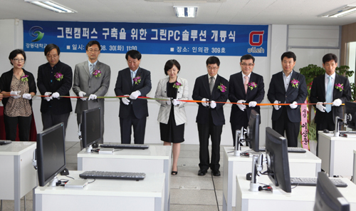 - 강동대학교 그린캠퍼스 구축을 위한 그린PC 솔루션 마련 환경에 대한 관심이 지속적으로 높아짐에 따라 대학가에서는 ‘친환경’ 정책에 발맞춰 ‘친환경 그린캠퍼스’ 구축에 앞장서고 있다. ‘그린캠퍼스’는 각 대학에서 환경보전과 에너지 절약을 위한 방안을 마련하고, 지속가능한 방향으로 실천해 나가는 것을 의미한다. 최근 각 대학에서는 친환경 그린캠퍼스 도입을 통해 대학 내 환경 뿐만 아니라, 지역사회 발전에도 큰 몫을 하고 있다는 평가를 받고 있다. 최근 강동대학교는 ‘친환경 저탄소 그린캠퍼스’ 사업의 일환으로 KT와 협력하여, 교내 그린 PC 도입에 나섰다. 그린PC 도입은 캠퍼스 내 일부 건물을 중심으로 시범 운행되고 있으며 추후 환경영향평가와 수업 효율성 평가 후 교내에 단계적으로 확대될 방침이다. 그린 PC는 기존 전자설비들의 환경오염 문제와 전력낭비에 대한 문제점을 보완하기 위해 등장한 것으로 캠퍼스 내 저탄소, 저전력, 저발열, 저소음, 저관리비를 원칙을 실현해 나갈 예정이다. 류정윤 총장은 “우리 대학은 그린PC 도입을 통해 탄소 배출량 감소와 전기절약에 앞장설 것이며, 친환경 사업을 통한 쾌적한 캠퍼스 조성으로 학생들에게 양질의 교육환경을 제공할 것”이라 밝혔다. insun@osen.co.kr 강동대학교 제공.