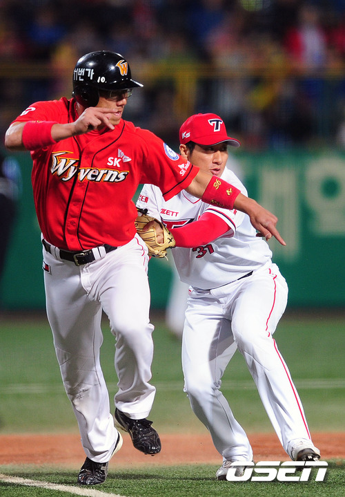 '2011 롯데카드 프로야구' KIA 타이거즈와 SK 와이번스의 준플레이오프 3차전이 11일 오후 광주 무등 야구장에서 열렸다. 2회초 무사 1,3루 박진만 내야땅볼때 3루 주자 박정권 협살아웃 처리되고 있다. 준플레이오프 3차전에서는 KIA 타이거즈의 '해외파 우완' 서재응과 SK 와이번스의 외국인 투수 브라이언 고든이 맞대결을 펼쳤다. 3선승제의 준플레이오프에서 각각 1승 1패로 한 번씩 주고받은 KIA와 SK는 플레이오프 진출을 위해서 꼭 잡아야 하는 3차전에서 총력을 기울이겠다는 각오다. 지난 1~2차전에서 보여주듯 철저한 투수전 양상으로 흐르는 준플레이오프에서 SK는 강점인 불펜의 힘을 극대화 하고, KIA는 불펜의 약점을 얼마나 상쇄할 수 있느냐가 관건이다. 또 양 팀 모두 극도의 빈타에서 탈출해야 한다. 앞서 SK는 시즌 종반 김성근 전 감독의 사퇴로 내홍을 앓았고 KIA는 시즌 중반 1위에서 4위로 떨어지는 심각한 성적 하락을 겪은 바 있다. 한편 프로야구 준플레이오프는 5전 3선승제로 진행된다. 8~9일 인천 문학구장에서 2연전이 진행됐고, 11~12일 광주구장에서 3, 4차전이 이어진다. 4차전까지 승부를 가리지 못하면 14일 문학구장으로 돌아와 최종전을 벌인다./ ajyoung@osen.co.kr