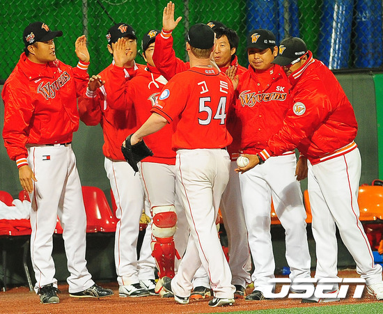 '2011 롯데카드 프로야구' KIA 타이거즈와 SK 와이번스의 준플레이오프 3차전이 11일 오후 광주 무등 야구장에서 열렸다. 3회를 마무리한 SK 선발 고든이 SK 불펜 앞에서 동료들과 하이파이브를 하고 있다. 준플레이오프 3차전에서는 KIA 타이거즈의 '해외파 우완' 서재응과 SK 와이번스의 외국인 투수 브라이언 고든이 맞대결을 펼쳤다. 3선승제의 준플레이오프에서 각각 1승 1패로 한 번씩 주고받은 KIA와 SK는 플레이오프 진출을 위해서 꼭 잡아야 하는 3차전에서 총력을 기울이겠다는 각오다. 지난 1~2차전에서 보여주듯 철저한 투수전 양상으로 흐르는 준플레이오프에서 SK는 강점인 불펜의 힘을 극대화 하고, KIA는 불펜의 약점을 얼마나 상쇄할 수 있느냐가 관건이다. 또 양 팀 모두 극도의 빈타에서 탈출해야 한다. 앞서 SK는 시즌 종반 김성근 전 감독의 사퇴로 내홍을 앓았고 KIA는 시즌 중반 1위에서 4위로 떨어지는 심각한 성적 하락을 겪은 바 있다. 한편 프로야구 준플레이오프는 5전 3선승제로 진행된다. 8~9일 인천 문학구장에서 2연전이 진행됐고, 11~12일 광주구장에서 3, 4차전이 이어진다. 4차전까지 승부를 가리지 못하면 14일 문학구장으로 돌아와 최종전을 벌인다. / rumi@osen.co.kr