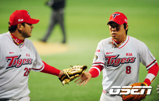 '2011 롯데카드 프로야구' KIA 타이거즈와 SK 와이번스의 준플레이오프 3차전이 11일 오후 광주 무등 야구장에서 열렸다. 4회초 1사 주자 2루 SK 박진만의 타구를 2루수 라인드라이브 아웃으로 처리한 후 2루주자 최정을 병살로 처리한 KIA 2루수 안치홍이 KIA 선발 서재응과 하이파이브를 하고 있다. 준플레이오프 3차전에서는 KIA 타이거즈의 '해외파 우완' 서재응과 SK 와이번스의 외국인 투수 브라이언 고든이 맞대결을 펼쳤다. 3선승제의 준플레이오프에서 각각 1승 1패로 한 번씩 주고받은 KIA와 SK는 플레이오프 진출을 위해서 꼭 잡아야 하는 3차전에서 총력을 기울이겠다는 각오다. 지난 1~2차전에서 보여주듯 철저한 투수전 양상으로 흐르는 준플레이오프에서 SK는 강점인 불펜의 힘을 극대화 하고, KIA는 불펜의 약점을 얼마나 상쇄할 수 있느냐가 관건이다. 또 양 팀 모두 극도의 빈타에서 탈출해야 한다. 앞서 SK는 시즌 종반 김성근 전 감독의 사퇴로 내홍을 앓았고 KIA는 시즌 중반 1위에서 4위로 떨어지는 심각한 성적 하락을 겪은 바 있다. 한편 프로야구 준플레이오프는 5전 3선승제로 진행된다. 8~9일 인천 문학구장에서 2연전이 진행됐고, 11~12일 광주구장에서 3, 4차전이 이어진다. 4차전까지 승부를 가리지 못하면 14일 문학구장으로 돌아와 최종전을 벌인다. / rumi@osen.co.kr