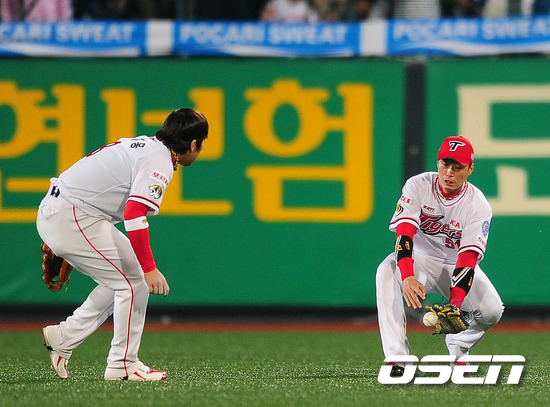 '2011 롯데카드 프로야구' KIA 타이거즈와 SK 와이번스의 준플레이오프 3차전이 11일 오후 광주 무등 야구장에서 열렸다. 5회초 1사 정상호 우익수앞 타구때 KIA 김원섭이 수비를 펼쳤으나 안타를 허용하고 있다. 준플레이오프 3차전에서는 KIA 타이거즈의 '해외파 우완' 서재응과 SK 와이번스의 외국인 투수 브라이언 고든이 맞대결을 펼쳤다. 3선승제의 준플레이오프에서 각각 1승 1패로 한 번씩 주고받은 KIA와 SK는 플레이오프 진출을 위해서 꼭 잡아야 하는 3차전에서 총력을 기울이겠다는 각오다. 지난 1~2차전에서 보여주듯 철저한 투수전 양상으로 흐르는 준플레이오프에서 SK는 강점인 불펜의 힘을 극대화 하고, KIA는 불펜의 약점을 얼마나 상쇄할 수 있느냐가 관건이다. 또 양 팀 모두 극도의 빈타에서 탈출해야 한다. 앞서 SK는 시즌 종반 김성근 전 감독의 사퇴로 내홍을 앓았고 KIA는 시즌 중반 1위에서 4위로 떨어지는 심각한 성적 하락을 겪은 바 있다. 한편 프로야구 준플레이오프는 5전 3선승제로 진행된다. 8~9일 인천 문학구장에서 2연전이 진행됐고, 11~12일 광주구장에서 3, 4차전이 이어진다. 4차전까지 승부를 가리지 못하면 14일 문학구장으로 돌아와 최종전을 벌인다./ ajyoung@osen.co.kr