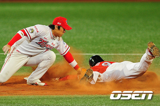 '2011 롯데카드 프로야구' KIA 타이거즈와 SK 와이번스의 준플레이오프 3차전이 11일 오후 광주 무등 야구장에서 열렸다. 5회초 2사 주자 1루 SK 정근우 타석에서 1루 주자 임훈이 2루 도루를 시도, KIA 2루수 안치홍에게 태그아웃을 당하고 있다. 준플레이오프 3차전에서는 KIA 타이거즈의 '해외파 우완' 서재응과 SK 와이번스의 외국인 투수 브라이언 고든이 맞대결을 펼쳤다. 3선승제의 준플레이오프에서 각각 1승 1패로 한 번씩 주고받은 KIA와 SK는 플레이오프 진출을 위해서 꼭 잡아야 하는 3차전에서 총력을 기울이겠다는 각오다. 지난 1~2차전에서 보여주듯 철저한 투수전 양상으로 흐르는 준플레이오프에서 SK는 강점인 불펜의 힘을 극대화 하고, KIA는 불펜의 약점을 얼마나 상쇄할 수 있느냐가 관건이다. 또 양 팀 모두 극도의 빈타에서 탈출해야 한다. 앞서 SK는 시즌 종반 김성근 전 감독의 사퇴로 내홍을 앓았고 KIA는 시즌 중반 1위에서 4위로 떨어지는 심각한 성적 하락을 겪은 바 있다. 한편 프로야구 준플레이오프는 5전 3선승제로 진행된다. 8~9일 인천 문학구장에서 2연전이 진행됐고, 11~12일 광주구장에서 3, 4차전이 이어진다. 4차전까지 승부를 가리지 못하면 14일 문학구장으로 돌아와 최종전을 벌인다. / rumi@osen.co.kr
