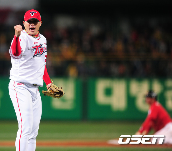 '2011 롯데카드 프로야구' KIA 타이거즈와 SK 와이번스의 준플레이오프 3차전이 11일 오후 광주 무등 야구장에서 열렸다. 5회초 2사 1루 KIA 선발 서재응이 정근우 타석때 1루 주자 임훈의 2루 도루때 아웃처리 시키며 공수교대를 하며 환호하고 있다. 준플레이오프 3차전에서는 KIA 타이거즈의 '해외파 우완' 서재응과 SK 와이번스의 외국인 투수 브라이언 고든이 맞대결을 펼쳤다. 3선승제의 준플레이오프에서 각각 1승 1패로 한 번씩 주고받은 KIA와 SK는 플레이오프 진출을 위해서 꼭 잡아야 하는 3차전에서 총력을 기울이겠다는 각오다. 지난 1~2차전에서 보여주듯 철저한 투수전 양상으로 흐르는 준플레이오프에서 SK는 강점인 불펜의 힘을 극대화 하고, KIA는 불펜의 약점을 얼마나 상쇄할 수 있느냐가 관건이다. 또 양 팀 모두 극도의 빈타에서 탈출해야 한다. 앞서 SK는 시즌 종반 김성근 전 감독의 사퇴로 내홍을 앓았고 KIA는 시즌 중반 1위에서 4위로 떨어지는 심각한 성적 하락을 겪은 바 있다. 한편 프로야구 준플레이오프는 5전 3선승제로 진행된다. 8~9일 인천 문학구장에서 2연전이 진행됐고, 11~12일 광주구장에서 3, 4차전이 이어진다. 4차전까지 승부를 가리지 못하면 14일 문학구장으로 돌아와 최종전을 벌인다./ ajyoung@osen.co.kr