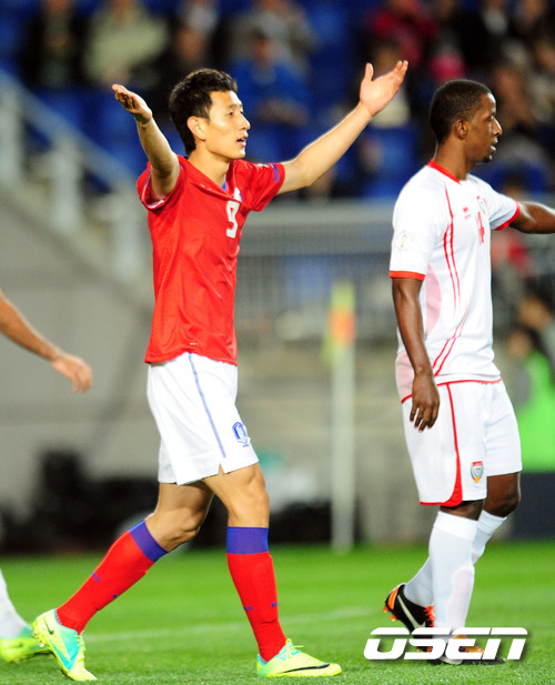 조광래 감독이 이끄는 축구대표팀이 11일 오후 수원월드컵경기장에서 아랍에미리트연합(UAE)와 2014 브라질 월드컵 아시아지역 3차예선 B조 3차전을 가졌다. 전반 지동원이 코너킥이라고 주심에게 어필 하고 있다. 1승1무를 기록하고 있는 대표팀은 향후 중동 2경기 원정(UAE-레바논)의 부담감을 덜기 위해 반드시 승리해야 하는 상황이다. 조광래 감독은 공격진에 구자철-기성용-이용래로 이어지는 삼각형 미드필더에 박주영과 지동원, '조커' 이동국을 내세워 대량 득점을 노리고 있다. /spjj@osen.co.kr
