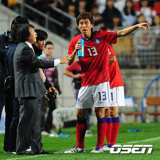 조광래 감독이 이끄는 축구대표팀이 11일 오후 수원월드컵경기장에서 아랍에미리트연합(UAE)와 2014 브라질 월드컵 아시아지역 3차예선 B조 3차전을 가졌다. 전반 한국 조광래 감독과 구자철이 이야기를 나누고 있다. 1승1무를 기록하고 있는 대표팀은 향후 중동 2경기 원정(UAE-레바논)의 부담감을 덜기 위해 반드시 승리해야 하는 상황이다. 조광래 감독은 공격진에 구자철-기성용-이용래로 이어지는 삼각형 미드필더에 박주영과 지동원, '조커' 이동국을 내세워 대량 득점을 노리고 있다. /jpnews@osen.co.kr