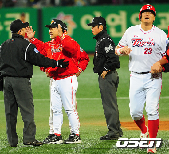 '2011 롯데카드 프로야구' KIA 타이거즈와 SK 와이번스의 준플레이오프 3차전이 11일 오후 광주 무등 야구장에서 열렸다. 6회말 무사 주자 1루 KIA 김상현의 1루수 앞 땅볼때 1루주자 최희섭이 SK 유격수 박진만에게 포스아웃을 당했다. 그 후 박진만이 1루로 송구하던 볼이 최희섭에 손에 맞아 병살을 면했다. 최희섭이 고통을 호소하며 덕아웃으로 향하고 있다. SK 이만수 감독대행이 구심에게 강하게 항의하고 있다. 준플레이오프 3차전에서는 KIA 타이거즈의 '해외파 우완' 서재응과 SK 와이번스의 외국인 투수 브라이언 고든이 맞대결을 펼쳤다. 3선승제의 준플레이오프에서 각각 1승 1패로 한 번씩 주고받은 KIA와 SK는 플레이오프 진출을 위해서 꼭 잡아야 하는 3차전에서 총력을 기울이겠다는 각오다. 지난 1~2차전에서 보여주듯 철저한 투수전 양상으로 흐르는 준플레이오프에서 SK는 강점인 불펜의 힘을 극대화 하고, KIA는 불펜의 약점을 얼마나 상쇄할 수 있느냐가 관건이다. 또 양 팀 모두 극도의 빈타에서 탈출해야 한다. 앞서 SK는 시즌 종반 김성근 전 감독의 사퇴로 내홍을 앓았고 KIA는 시즌 중반 1위에서 4위로 떨어지는 심각한 성적 하락을 겪은 바 있다. 한편 프로야구 준플레이오프는 5전 3선승제로 진행된다. 8~9일 인천 문학구장에서 2연전이 진행됐고, 11~12일 광주구장에서 3, 4차전이 이어진다. 4차전까지 승부를 가리지 못하면 14일 문학구장으로 돌아와 최종전을 벌인다. / rumi@osen.co.kr