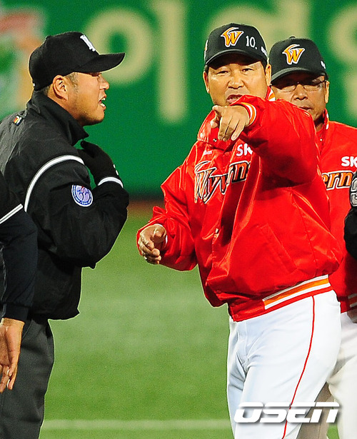 '2011 롯데카드 프로야구' KIA 타이거즈와 SK 와이번스의 준플레이오프 3차전이 11일 오후 광주 무등 야구장에서 열렸다. 6회말 무사 주자 1루 KIA 김상현의 1루수 앞 땅볼때 1루주자 최희섭이 SK 유격수 박진만에게 포스아웃을 당했다. 그 후 박진만이 1루로 송구하던 볼이 최희섭에 손에 맞아 병살에 실패했다. SK 이만수 감독 대행이 구심에게 강하게 항의하고 있다. 준플레이오프 3차전에서는 KIA 타이거즈의 '해외파 우완' 서재응과 SK 와이번스의 외국인 투수 브라이언 고든이 맞대결을 펼쳤다. 3선승제의 준플레이오프에서 각각 1승 1패로 한 번씩 주고받은 KIA와 SK는 플레이오프 진출을 위해서 꼭 잡아야 하는 3차전에서 총력을 기울이겠다는 각오다. 지난 1~2차전에서 보여주듯 철저한 투수전 양상으로 흐르는 준플레이오프에서 SK는 강점인 불펜의 힘을 극대화 하고, KIA는 불펜의 약점을 얼마나 상쇄할 수 있느냐가 관건이다. 또 양 팀 모두 극도의 빈타에서 탈출해야 한다. 앞서 SK는 시즌 종반 김성근 전 감독의 사퇴로 내홍을 앓았고 KIA는 시즌 중반 1위에서 4위로 떨어지는 심각한 성적 하락을 겪은 바 있다. 한편 프로야구 준플레이오프는 5전 3선승제로 진행된다. 8~9일 인천 문학구장에서 2연전이 진행됐고, 11~12일 광주구장에서 3, 4차전이 이어진다. 4차전까지 승부를 가리지 못하면 14일 문학구장으로 돌아와 최종전을 벌인다. / rumi@osen.co.kr