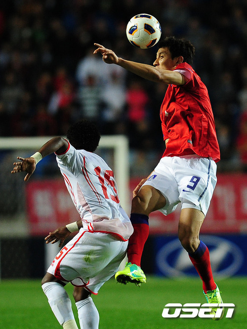 조광래 감독이 이끄는 축구대표팀이 11일 오후 수원월드컵경기장에서 아랍에미리트연합(UAE)와 2014 브라질 월드컵 아시아지역 3차예선 B조 3차전을 가졌다. 전반 한국 지동원이 UAE 수비수에 앞서 공중볼을 따내고 있다. 1승1무를 기록하고 있는 대표팀은 향후 중동 2경기 원정(UAE-레바논)의 부담감을 덜기 위해 반드시 승리해야 하는 상황이다. 조광래 감독은 공격진에 구자철-기성용-이용래로 이어지는 삼각형 미드필더에 박주영과 지동원, '조커' 이동국을 내세워 대량 득점을 노리고 있다. /jpnews@osen.co.kr