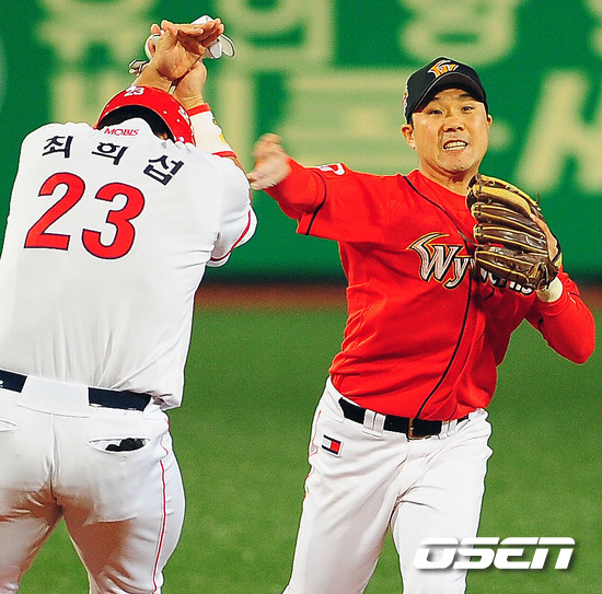 '2011 롯데카드 프로야구' KIA 타이거즈와 SK 와이번스의 준플레이오프 3차전이 11일 오후 광주 무등 야구장에서 열렸다. 6회말 무사 주자 1루 KIA 김상현의 1루수 앞 땅볼때 1루주자 최희섭이 SK 유격수 박진만에게 포스아웃을 당했다. 그 후 박진만이 1루로 송구하던 볼이 최희섭에 손에 맞고 있다. 준플레이오프 3차전에서는 KIA 타이거즈의 '해외파 우완' 서재응과 SK 와이번스의 외국인 투수 브라이언 고든이 맞대결을 펼쳤다. 3선승제의 준플레이오프에서 각각 1승 1패로 한 번씩 주고받은 KIA와 SK는 플레이오프 진출을 위해서 꼭 잡아야 하는 3차전에서 총력을 기울이겠다는 각오다. 지난 1~2차전에서 보여주듯 철저한 투수전 양상으로 흐르는 준플레이오프에서 SK는 강점인 불펜의 힘을 극대화 하고, KIA는 불펜의 약점을 얼마나 상쇄할 수 있느냐가 관건이다. 또 양 팀 모두 극도의 빈타에서 탈출해야 한다. 앞서 SK는 시즌 종반 김성근 전 감독의 사퇴로 내홍을 앓았고 KIA는 시즌 중반 1위에서 4위로 떨어지는 심각한 성적 하락을 겪은 바 있다. 한편 프로야구 준플레이오프는 5전 3선승제로 진행된다. 8~9일 인천 문학구장에서 2연전이 진행됐고, 11~12일 광주구장에서 3, 4차전이 이어진다. 4차전까지 승부를 가리지 못하면 14일 문학구장으로 돌아와 최종전을 벌인다. / rumi@osen.co.kr