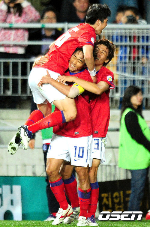 조광래 감독이 이끄는 축구대표팀이 11일 오후 수원월드컵경기장에서 아랍에미리트연합(UAE)와 2014 브라질 월드컵 아시아지역 3차예선 B조 3차전을 가졌다. 후반 박주영이 선제골을 넣고 동료들과 기쁨을 나누고 있다. 1승1무를 기록하고 있는 대표팀은 향후 중동 2경기 원정(UAE-레바논)의 부담감을 덜기 위해 반드시 승리해야 하는 상황이다. 조광래 감독은 공격진에 구자철-기성용-이용래로 이어지는 삼각형 미드필더에 박주영과 지동원, '조커' 이동국을 내세워 대량 득점을 노리고 있다. /spjj@osen.co.kr