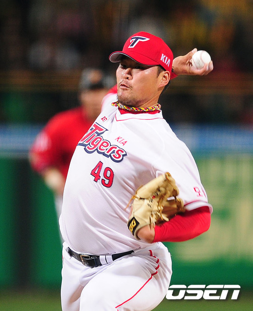 성공적인 가을잔치 복귀전이었다. KIA 우완 투수 김진우(28)가 5년만의 포스트시즌 등판에서 인상적인 피칭을 펼쳤다. 김진우는 11일 광주구장에서 열린 '2011 롯데카드 프로야구' SK와 준플레이오프 3차전에서 4번째 투수로 구원등판해 3⅓이닝을 1피안타 3탈삼진 무실점으로 호투했다. 승패를 떠나 KIA에게는 대단히 고무적인 피칭이었다. 무단이탈과 임의탈퇴로 그라운드를 떠나있다 올해 4년 만에 컴백한 김진우에게 마지막 포스트시즌은 5년 전인 2006년 한화와의 준플레이오프였다. 당시 1차전 선발로 나온 김진우는 5⅔이닝 4피안타 1볼넷 1사구 4탈삼진 2실점으로 호투했다. 1~2차전에서 등판 기회를 잡지 못한 김진우는 절체절명의 순간 벤치의 부름을 받았다. 0-2로 뒤진 6회초 2사 만루에서 유동훈에 이어 팀의 4번째 투수로 마운드에 오른 것이다. 5년2일 날짜로는 무려 1829일만의 감격적인 포스트시즌 등판. 그러나 감격을 만끽하기에는 상황이 너무 급박했다. SK에 선취점을 내주며 흐름을 빼앗긴 가운데 주자는 만루. 상대 타자는 장타력을 갖춘 정상호였다. 김진우는 초구부터 직구 승부했다. 145km 직구를 몸쪽으로 바짝 붙였고, 정상호는 파울로 커트했다. 이어 2구째 128km 빠른 커브로 투수 앞 땅볼을 유도했다. 대량실점 위기를 넘기는 순간이었다. 7회에도 등판한 김진우는 거칠게 없었다. 선두타자 임훈을 5구째 몸쪽 낮게 떨어지는 커브로 헛스윙 삼진 처리하더니 정근우마저 초구 커브로 3루 땅볼 요리했다. 이어 박재상까지 3구 만에 유격수 땅볼 유도했다. 최고 145km 묵직한 직구와 각도 큰 커브로 SK 타선을 공 9개로 삼자범퇴 속전속결 처리했다. 8회에도 선두타자 최정을 4구째 127km 커브로 스탠딩 삼진 잡은 김진우는 박정권에게 우전 안타를 맞았지만 안치용을 다시 한번 낙차 큰 커브로 스탠딩 삼진 처리했다. 이 과정에서 2루 도루를 허용해 득점권 위기에 몰렸지만 박진만에게 4구 연속 커브로 승부하며 중견수 뜬공 잡았다. 9회에는 커브 대신 체인지업 비율을 높이며 내야 플라이 2개와 땅볼로 SK 타선을 삼자범퇴로 돌려세웠다. 직구 최고 구속은 147km까지 올라와 있었다. 3⅓이닝 1피안타 무사사구 3탈삼진 무실점. 총 투구수 37개 중 26개가 스트라이크였다. 11타자를 상대로 10차례나 초구 스트라이크를 잡을 정도로 공격적인 피칭. 각도 큰 커브(17개)를 중심으로 직구(14개)·체인지업(5개)·슬라이더(1개)를 섞어 던졌다. 묵직한 직구와 명품 커브 조합으로 경기 종반을 확실하게 책임졌다. 비록 KIA는 이날 패배로 벼랑 끝에 몰렸지만 김진우의 부활이라는 아주 큰 소득을 얻었다. waw@osen.co.kr 광주=김영민 기자 /ajyoung@osen.co.kr 광주=민경훈 기자 /rumi@osen.co.kr