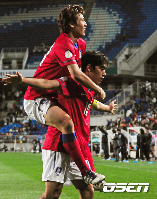 조광래 감독이 이끄는 축구대표팀이 11일 오후 수원월드컵경기장에서 아랍에미리트연합(UAE)와 2014 브라질 월드컵 아시아지역 3차예선 B조 3차전을 가졌다. 후반 한국 박주영이 선제골을 성공시키고 구자철과 기뻐하고 있다. 1승1무를 기록하고 있는 대표팀은 향후 중동 2경기 원정(UAE-레바논)의 부담감을 덜기 위해 반드시 승리해야 하는 상황이다. 조광래 감독은 공격진에 구자철-기성용-이용래로 이어지는 삼각형 미드필더에 박주영과 지동원, '조커' 이동국을 내세워 대량 득점을 노리고 있다. /jpnews@osen.co.kr