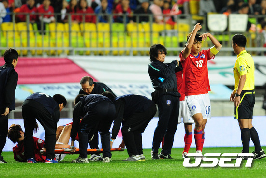 조광래 감독이 이끄는 축구대표팀이 11일 오후 수원월드컵경기장에서 아랍에미리트연합(UAE)와 2014 브라질 월드컵 아시아지역 3차예선 B조 3차전을 가졌다. 후반 한국 구자철이 부상을 당하자 박주영이 교체 신호를 보내고 있다. 1승1무를 기록하고 있는 대표팀은 향후 중동 2경기 원정(UAE-레바논)의 부담감을 덜기 위해 반드시 승리해야 하는 상황이다. 조광래 감독은 공격진에 구자철-기성용-이용래로 이어지는 삼각형 미드필더에 박주영과 지동원, '조커' 이동국을 내세워 대량 득점을 노리고 있다. /jpnews@osen.co.kr