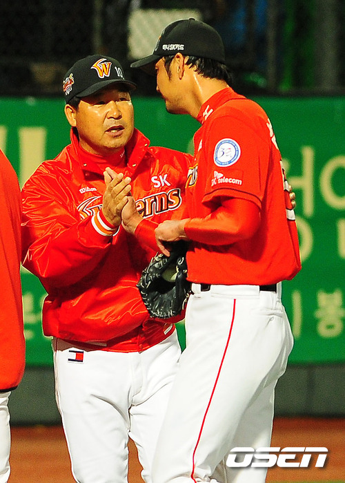'2011 롯데카드 프로야구' KIA 타이거즈와 SK 와이번스의 준플레이오프 3차전이 11일 오후 광주 무등 야구장에서 열렸다. 이 날 경기에서 선발 고든과 철벽불펜의 완벽투, 해결사 안치용의 2타점 결승타에 힘입어 2-0으로 승리했다. 1차전 패배 이후 2연승을 달린 SK는 1승만 더하면 플레이오프에 진출한다. 반면 1승후 2연패를 당한 KIA는 벼랑끝에 몰리게 됐다. 양팀은 12일 같은 장소에서 4차전을 갖는다. 경기를 마치고 SK 이만수 감독대행이 마무리 엄정욱과 기쁨을 나누고 있다. /rumi@osen.co.kr