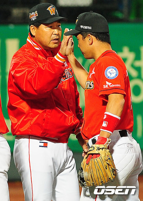 '2011 롯데카드 프로야구' KIA 타이거즈와 SK 와이번스의 준플레이오프 3차전이 11일 오후 광주 무등 야구장에서 열렸다. 이 날 경기에서 선발 고든과 철벽불펜의 완벽투, 해결사 안치용의 2타점 결승타에 힘입어 2-0으로 승리했다. 1차전 패배 이후 2연승을 달린 SK는 1승만 더하면 플레이오프에 진출한다. 반면 1승후 2연패를 당한 KIA는 벼랑끝에 몰리게 됐다. 양팀은 12일 같은 장소에서 4차전을 갖는다. 경기를 마치고 SK 이만수 감독 대행이 정근우와 기쁨을 나누고 있다. /rumi@osen.co.kr