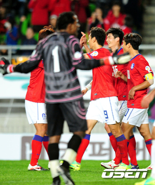 조광래 감독이 이끄는 축구대표팀이 11일 오후 수원월드컵경기장에서 아랍에미리트연합(UAE)와 2014 브라질 월드컵 아시아지역 3차예선 B조 3차전을 가졌다. 후반 기성용이 멋진 프리킥으로 UAE의 자책골을 이끌어내고 동료들과 기쁨을 나누고 있다. 1승1무를 기록하고 있는 대표팀은 향후 중동 2경기 원정(UAE-레바논)의 부담감을 덜기 위해 반드시 승리해야 하는 상황이다. 조광래 감독은 공격진에 구자철-기성용-이용래로 이어지는 삼각형 미드필더에 박주영과 지동원, '조커' 이동국을 내세워 대량 득점을 노리고 있다. /spjj@osen.co.kr