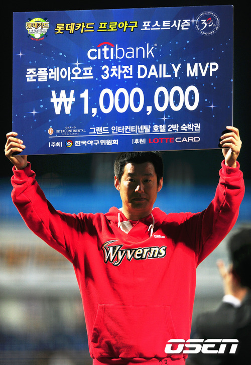 '2011 롯데카드 프로야구' KIA 타이거즈와 SK 와이번스의 준플레이오프 3차전이 11일 오후 광주 무등 야구장에서 열렸다. 경기 종료후 3차전 MVP에 오른 안치용이 시상대에서 포즈를 취하고 있다. 선발 고든의 무실점 호투와 안치용의 결승타에 힘입어 SK가 2-0 완승을 거두었다. 12일 광주구장에서 열리는 2011 롯데카드 프로야구 SK와 KIA의 준플레이오프 4차전. 11일 승리로 2승1패가 된 SK는 3선승제 준플레이오프에서 1승만 남긴 상태다. 반면 KIA는 2패에 몰리며 무조건 이겨야 하는 극박한 상황에 몰렸다. 3선승제의 준플레이오프에서 1승2패 KIA는 플레이오프 진출을 위해서 꼭 잡아야 하는 4차전에서 총력을 기울이겠다는 각오다. 한편 프로야구 준플레이오프는 5전 3선승제로 진행된다. 8~9일 인천 문학구장에서 2연전이 진행됐고, 11~12일 광주구장에서 3, 4차전이 이어진다. 4차전까지 승부를 가리지 못하면 14일 문학구장으로 돌아와 최종전을 벌인다./ ajyoung@osen.co.kr