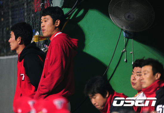 '2011 롯데카드 프로야구' KIA 타이거즈와 SK 와이번스의 준플레이오프 3차전이 11일 오후 광주 무등 야구장에서 열렸다. 9회말 2사 상황에서 윤석민이 경기를 관전하고 있다. 선발 고든의 무실점 호투와 안치용의 결승타에 힘입어 SK가 2-0 완승을 거두었다. 12일 광주구장에서 열리는 2011 롯데카드 프로야구 SK와 KIA의 준플레이오프 4차전. 11일 승리로 2승1패가 된 SK는 3선승제 준플레이오프에서 1승만 남긴 상태다. 반면 KIA는 2패에 몰리며 무조건 이겨야 하는 극박한 상황에 몰렸다. 3선승제의 준플레이오프에서 1승2패 KIA는 플레이오프 진출을 위해서 꼭 잡아야 하는 4차전에서 총력을 기울이겠다는 각오다. 한편 프로야구 준플레이오프는 5전 3선승제로 진행된다. 8~9일 인천 문학구장에서 2연전이 진행됐고, 11~12일 광주구장에서 3, 4차전이 이어진다. 4차전까지 승부를 가리지 못하면 14일 문학구장으로 돌아와 최종전을 벌인다./ ajyoung@osen.co.kr