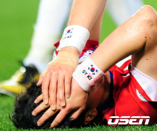 조광래 감독이 이끄는 축구대표팀이 11일 오후 수원월드컵경기장에서 아랍에미리트연합(UAE)와 2014 브라질 월드컵 아시아지역 3차예선 B조 3차전을 가졌다. 후반 기성용이 UAE 선수의 발에 얼굴을 맞고 쓰러져 있다. 1승1무를 기록하고 있는 대표팀은 향후 중동 2경기 원정(UAE-레바논)의 부담감을 덜기 위해 반드시 승리해야 하는 상황이다. 조광래 감독은 공격진에 구자철-기성용-이용래로 이어지는 삼각형 미드필더에 박주영과 지동원, '조커' 이동국을 내세워 대량 득점을 노리고 있다. /spjj@osen.co.kr